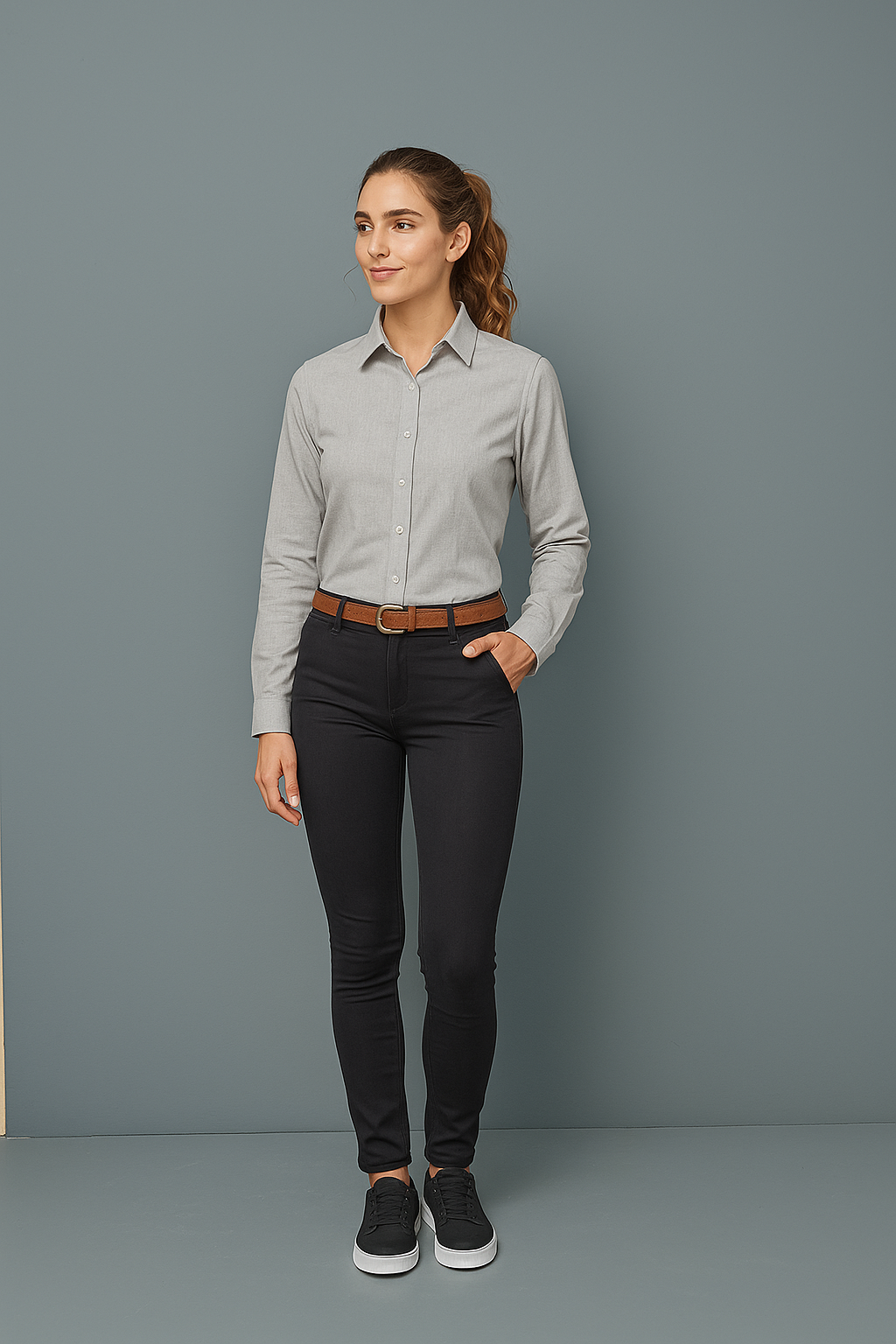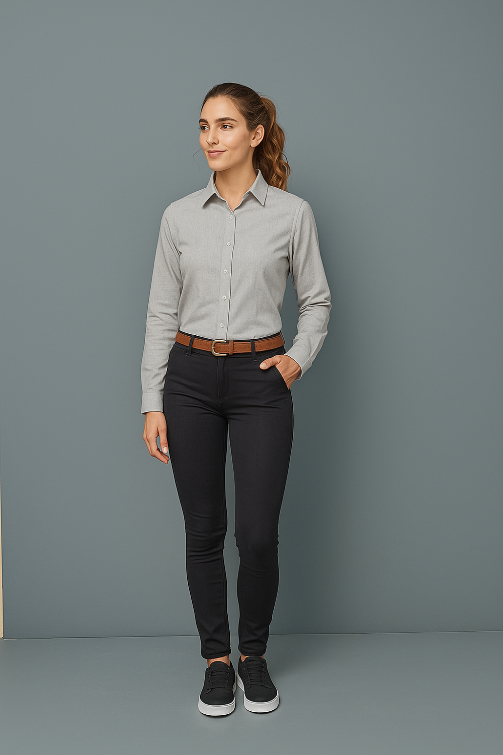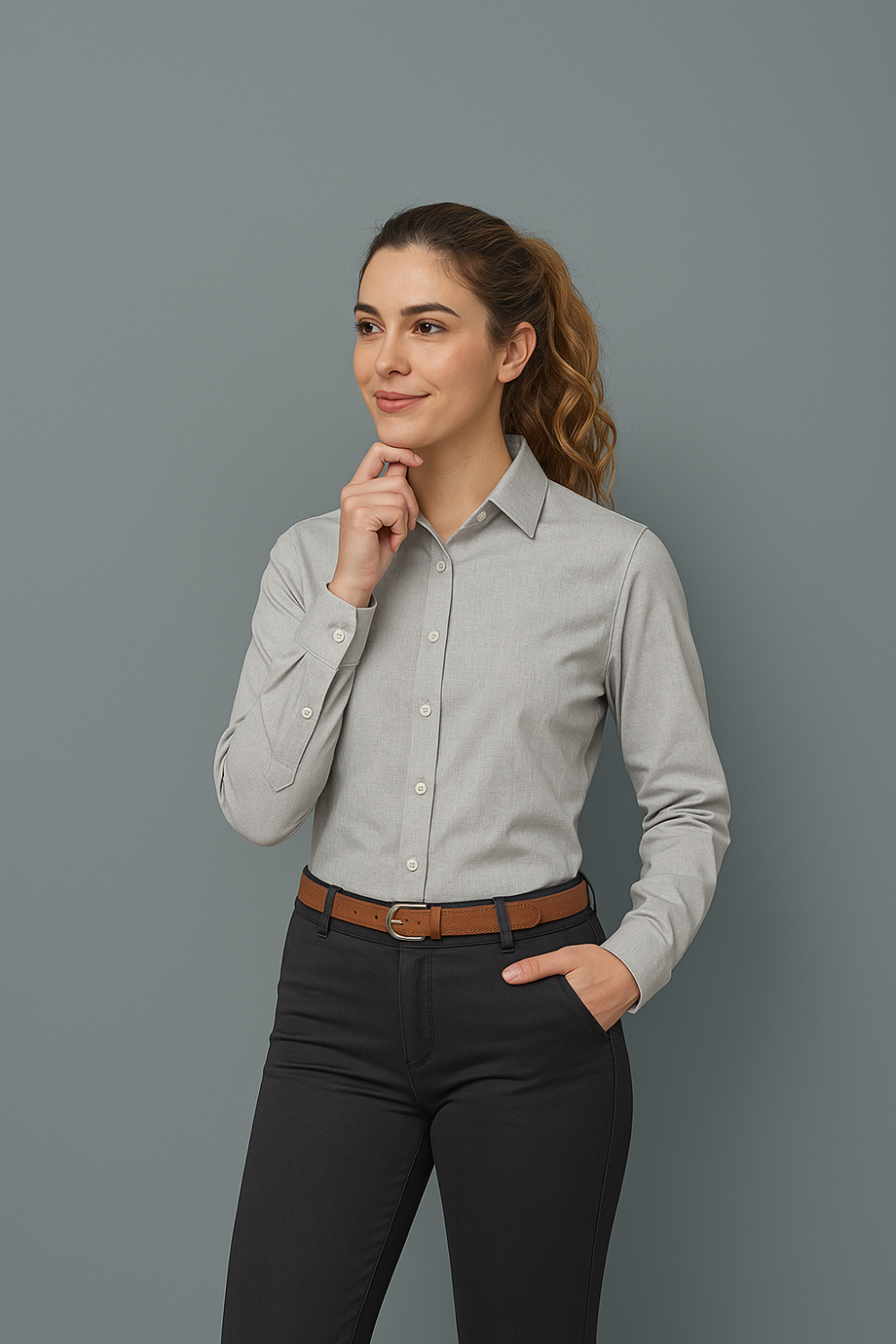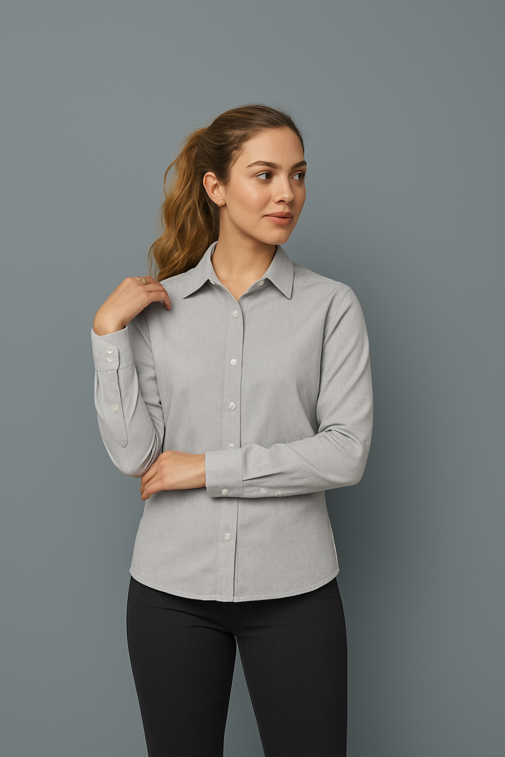 Camisa gris de mujer, manga larga, ideal para uniforme empresarial. Diseño clásico, cómodo y elegante. Confeccionada en tela resistente y fresca (65% algodón – 35% poliéster), fácil de planchar y perfecta para uso diario en oficinas, hoteles o recepciones.
